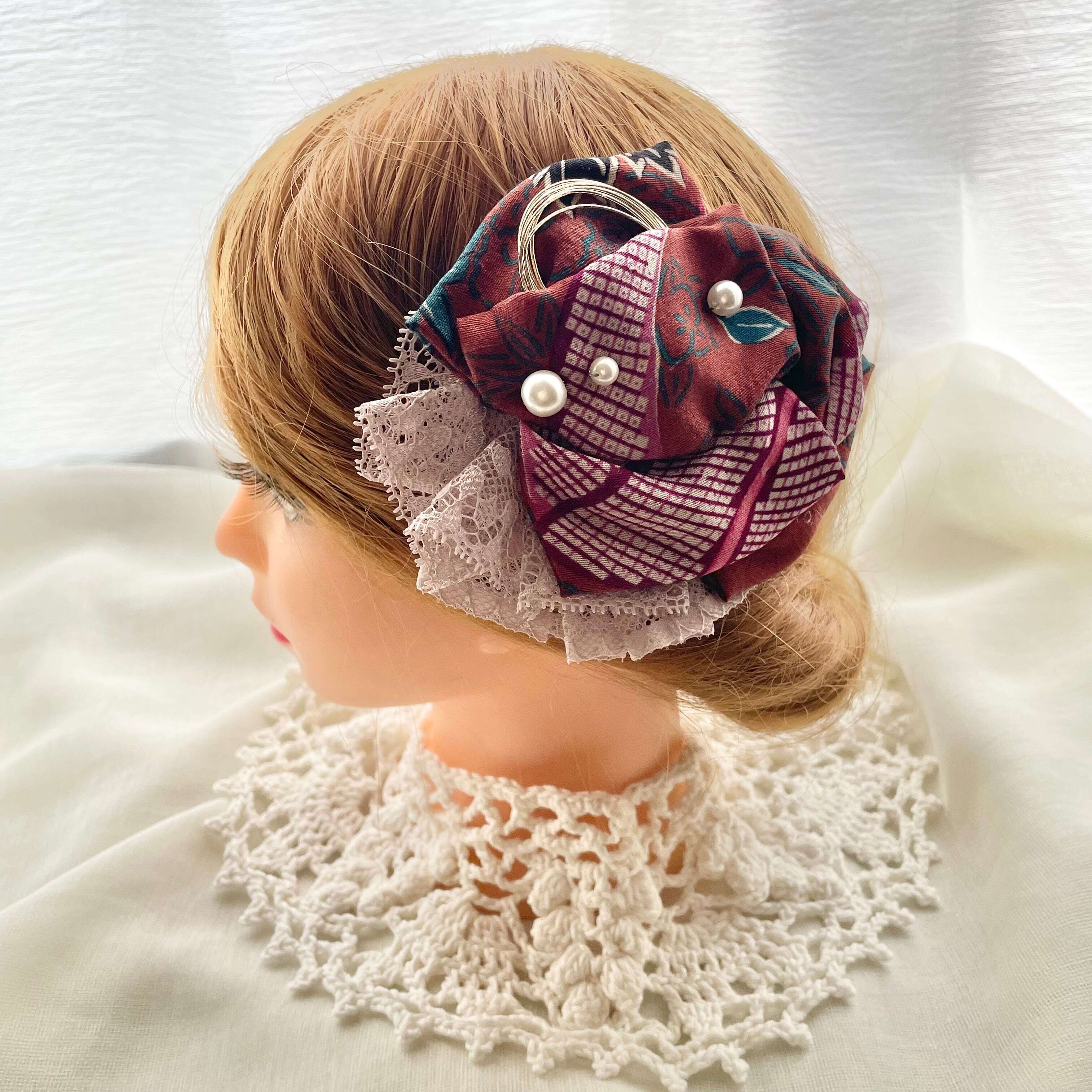 ミルフィーユのように何層も生地とレースを重ねた髪飾り。貴重なアンティークなど古布を使用しています。