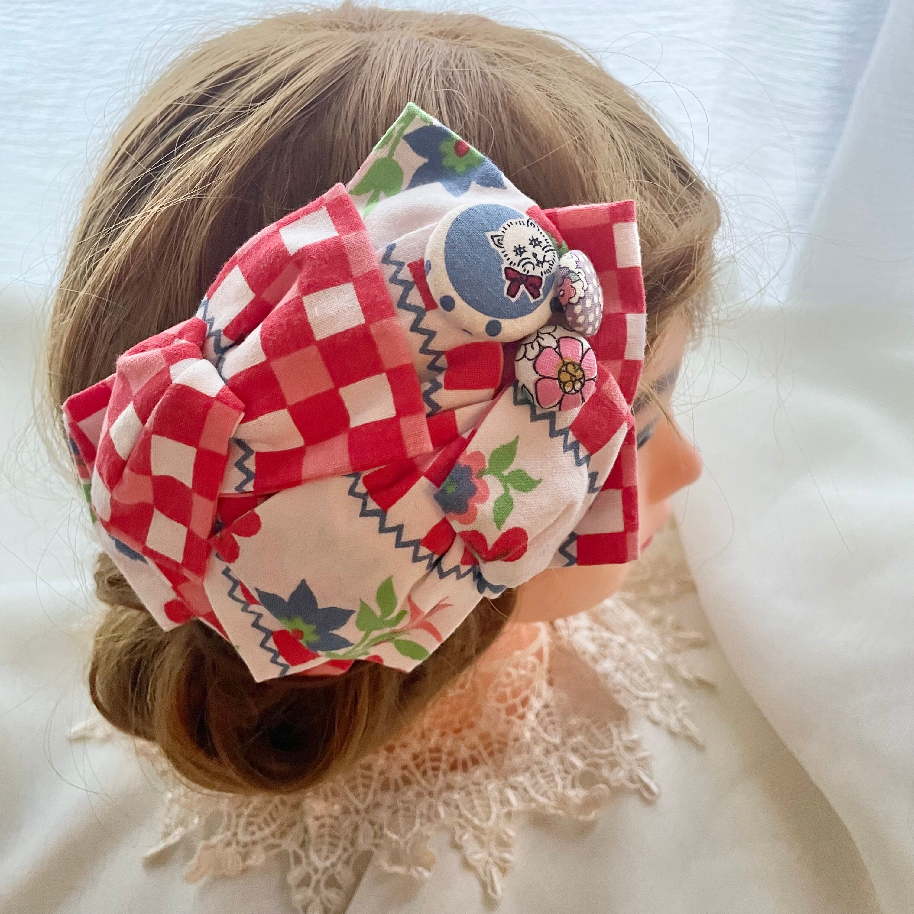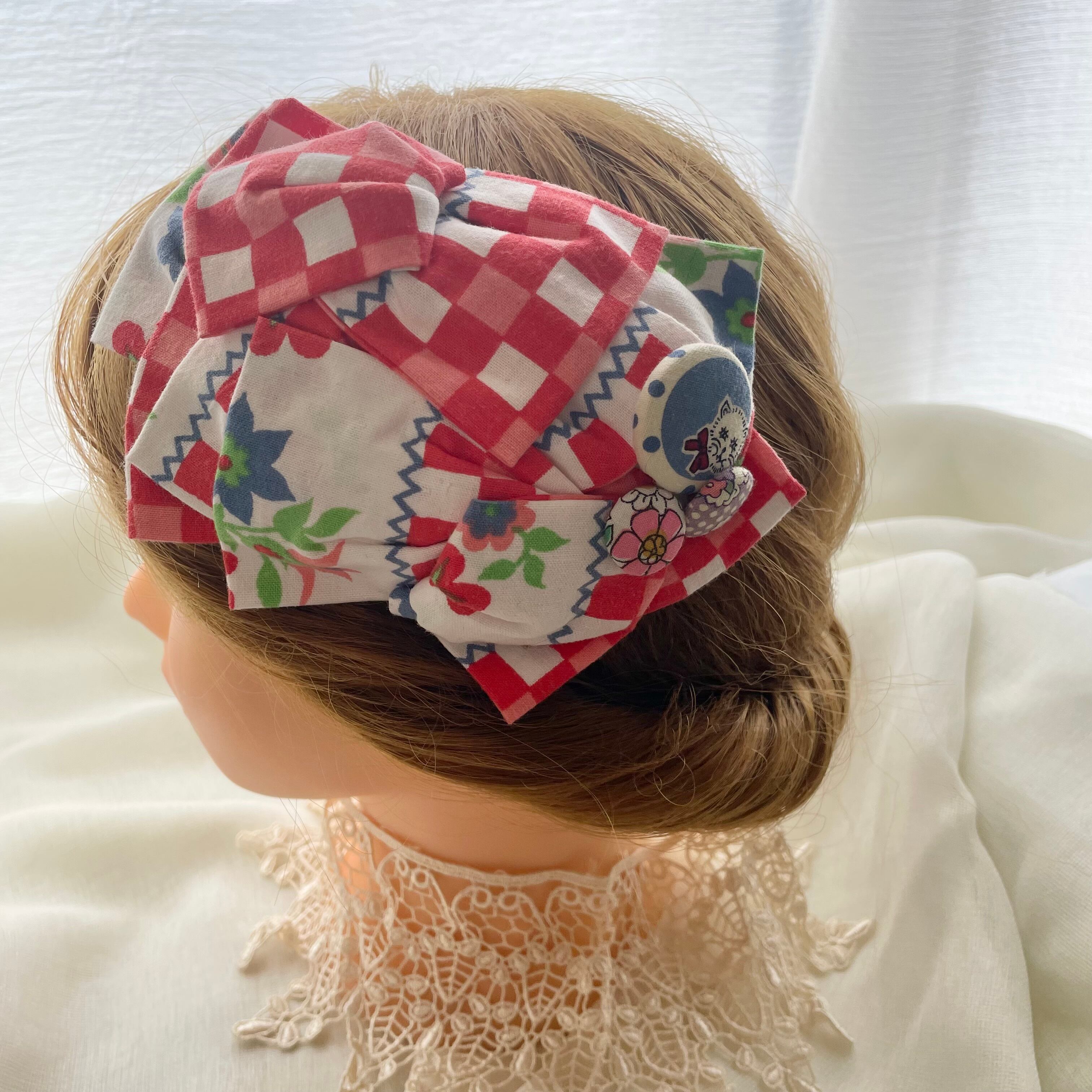 希少なドイツvintageの布はレトロな柄が個性的でありながらも使いやすくコーディネートのアクセントとして活躍してくれます。くるみボタンもレトロ柄にこだわった髪飾りです。裏側はコーム型なので、まとめ髪に差し込むだけで簡単に付けられます。コーム型はヘアゴムやピンなどで髪の毛を少し束にしてから固定していただくと短めのヘアアレンジにもお使い頂けます。