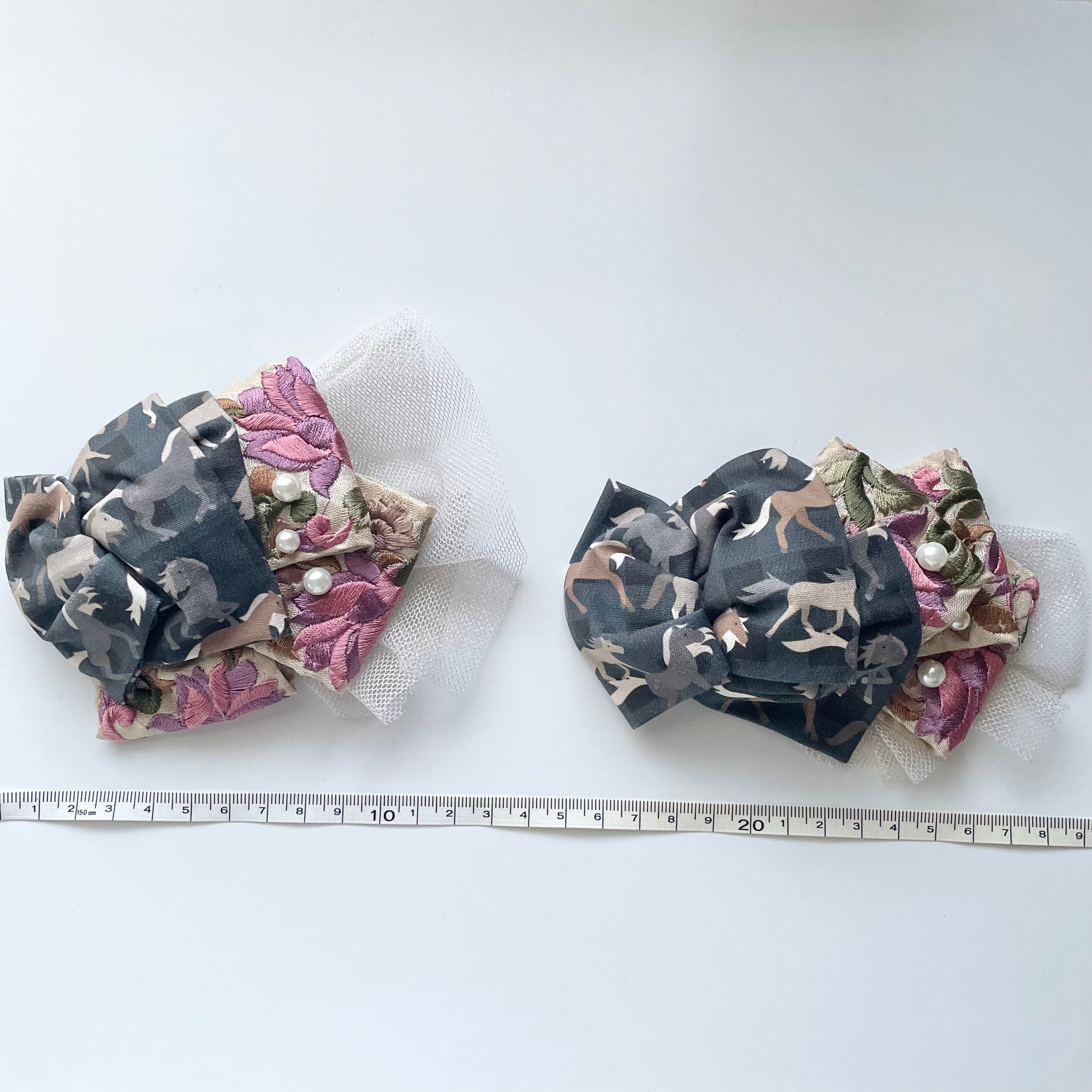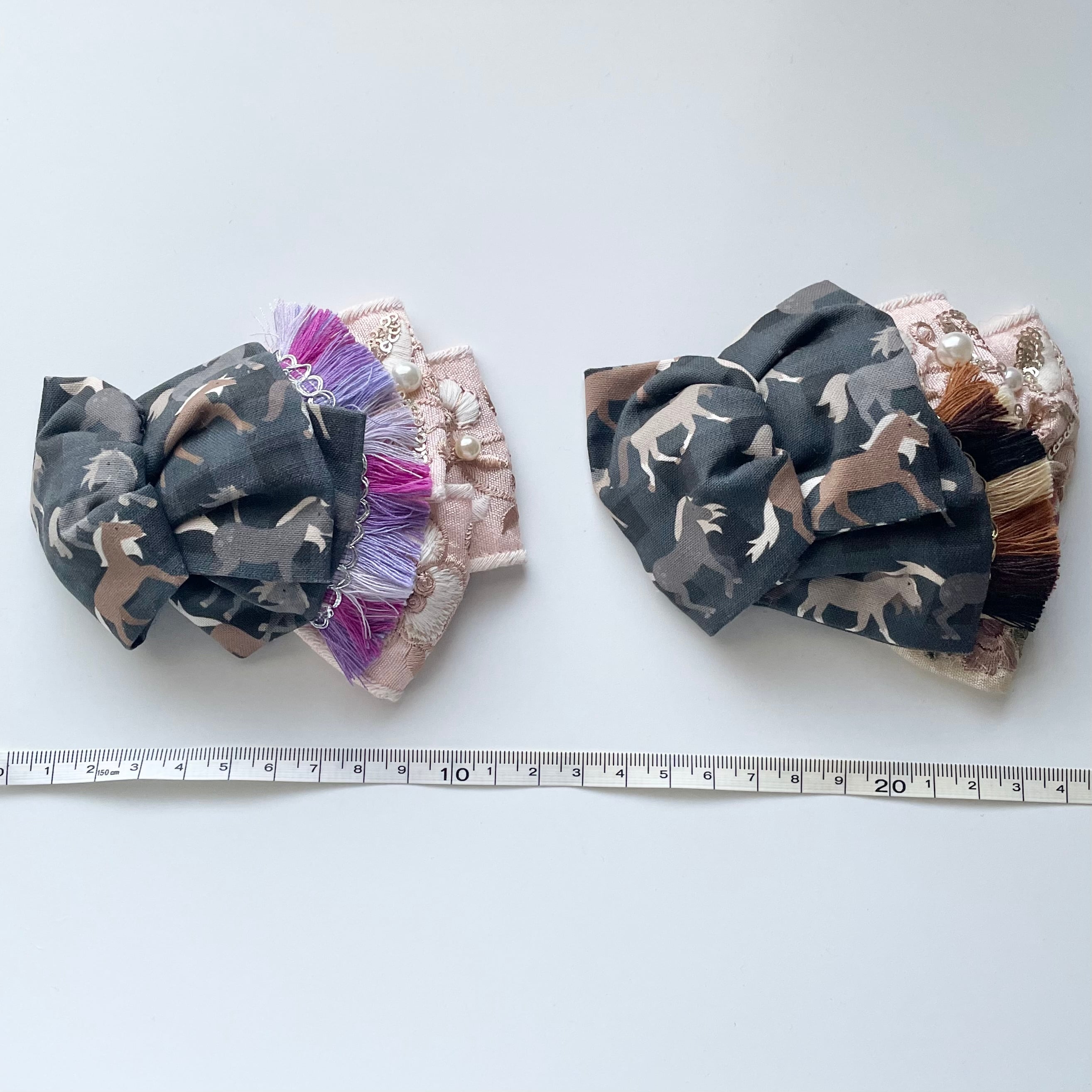 素材:馬柄生地、刺繍リボン、フリンジ、パール、フェルト、金属クリップ