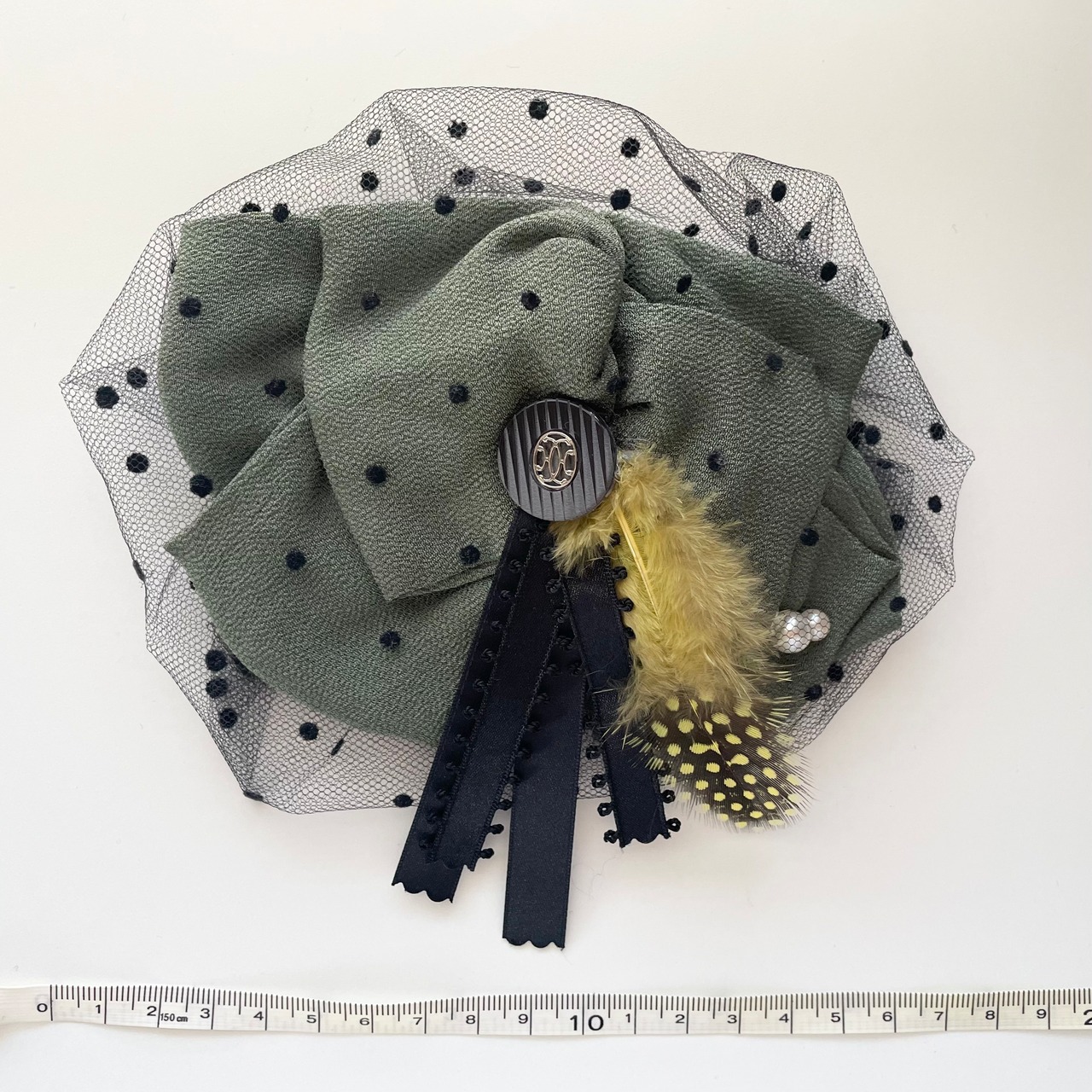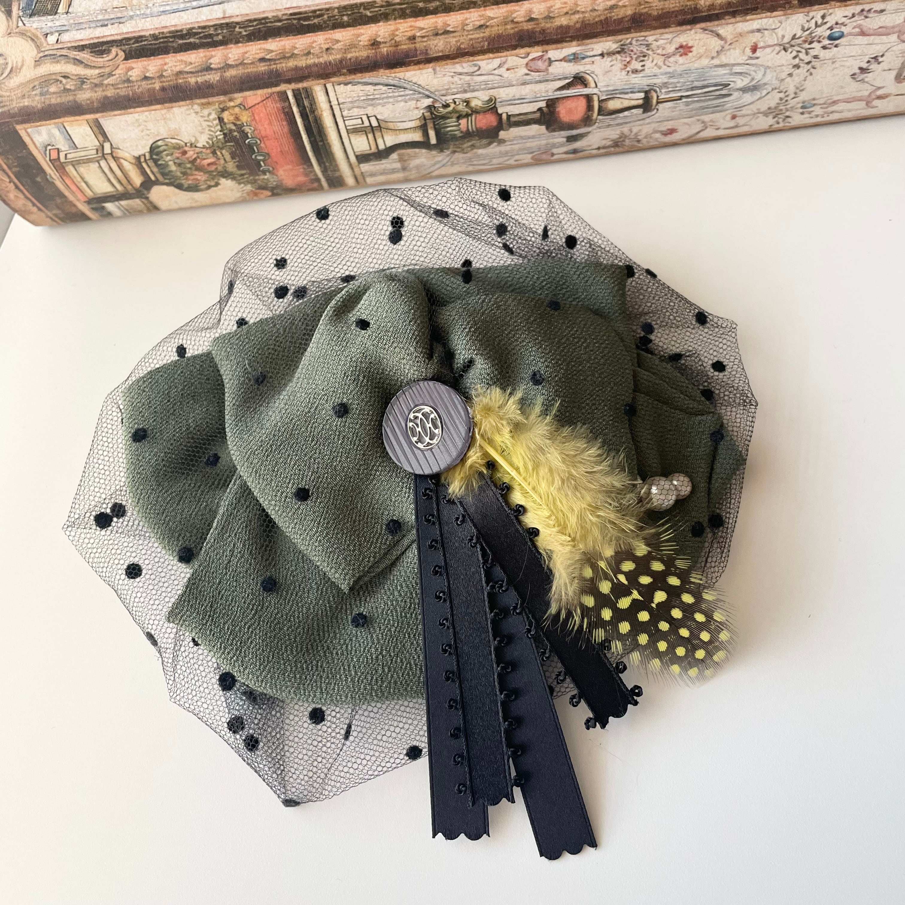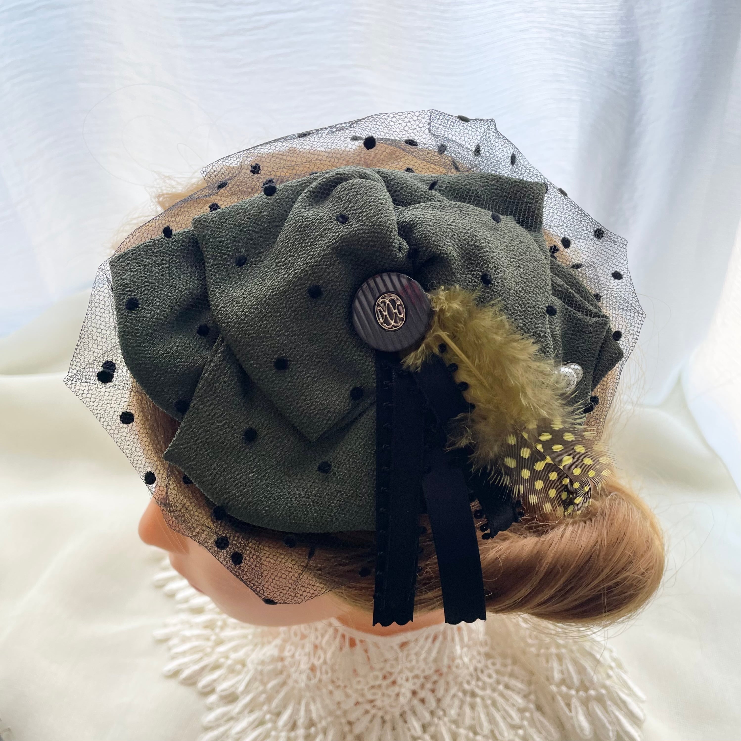 モダンで落ち着きあるトーンに黄色い羽根をポストに添えたヘッドドレスは、使いやすくちょっとしたパーティーから普段コーディネートのアクセントとして活躍してくれます。裏側はクリップ仕様なのでショートヘアからダウンスタイルまで幅広く簡単に付けられます。