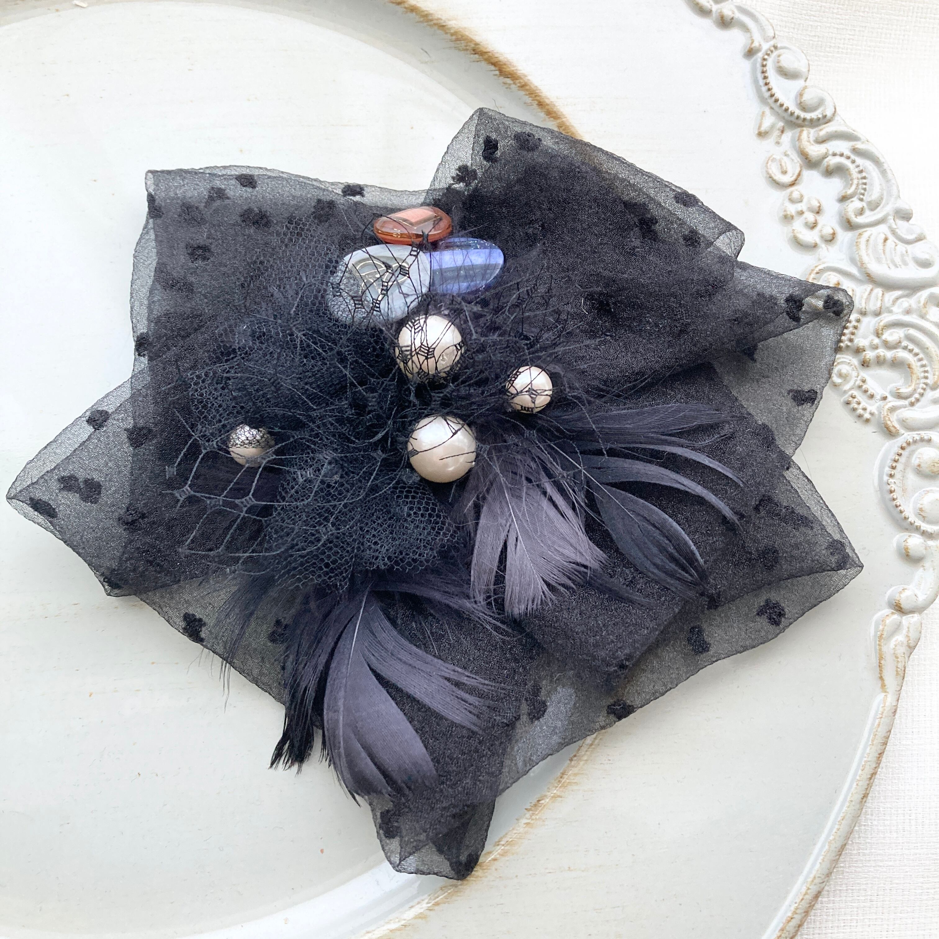 素材:造花、チュール、羽根、ヴィンテージボタン、パール、金属メッキ